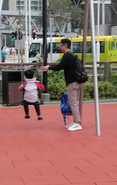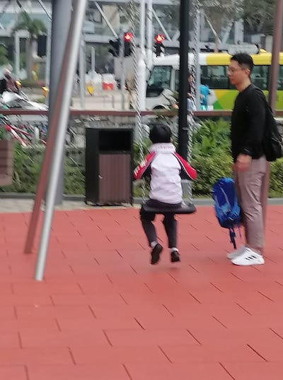 這位青年爸爸真夠意思,小朋友上課之前,帶他盪一下韆鞦。 |