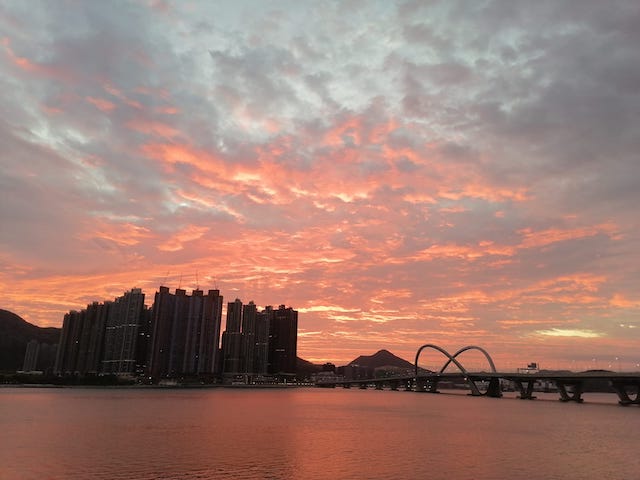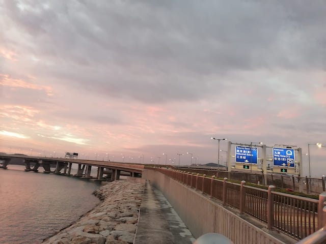不一會,雲橋亮出彩光,似是俯視海上水泥鋼筋人工傑作…… |