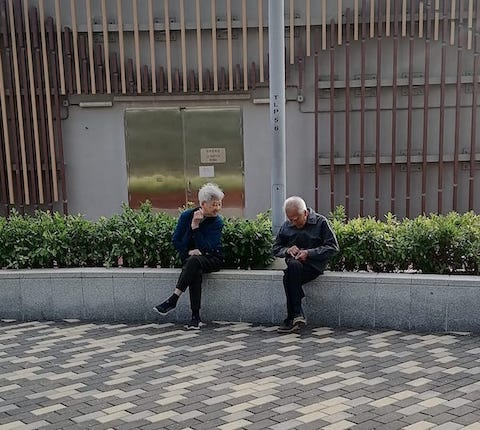 兩位先生端坐看花,看人來人往——相逢何必曾相識…… |