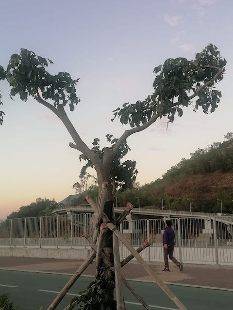 遠望,樹兒倚靠鐵絲網成長,它有安全感乎? |
