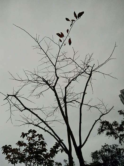 每天清晨路過,看似垂死枯樹,被雨露潤澤,這兒那兒長出青紅嫩葉。