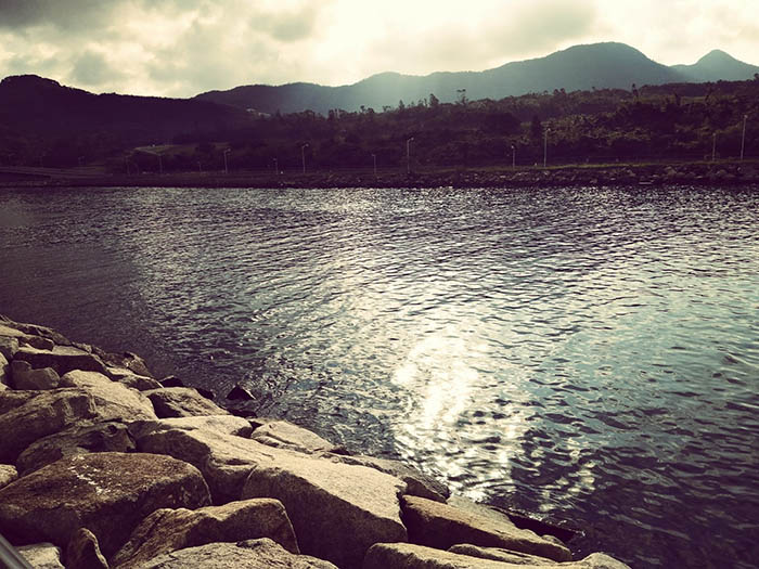 是日也,天仍未亮,對岸點點燈光倒照於深海,活像舞蹈家的立體舞態。 這邊一行石塊,在夜色反照,呈現出五彩古韻,望遠方頓生無限無崖感覺!