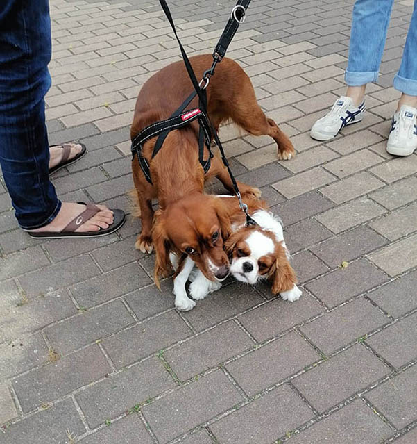 小小愛嬌伏在地上,大大愛惜把頭挨著小小…… 兩方主人站在旁邊,讚美這麼相愛相親…… | |