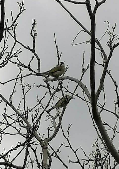 清晨濃霧,兩隻鳥兒向天放歌,是否為禿枝傳送,樹芽長了,葉隨生發…… | |