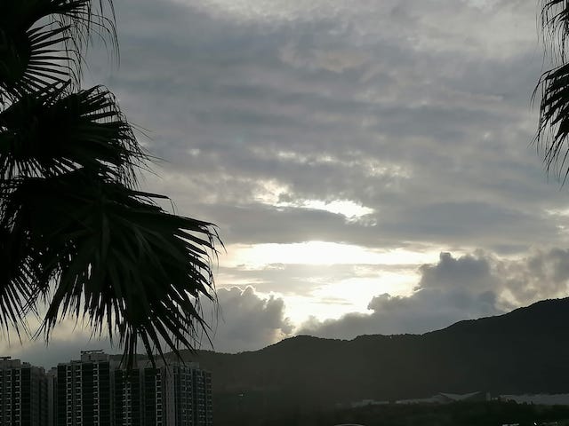 陽光沒現,天空昏暗,借問前方青綠在趕路麼? | |
