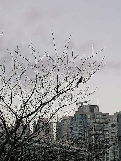 在枯樹與單獨鳥作襯底下,磚廈顯現一派冷硬寂靜。 | |