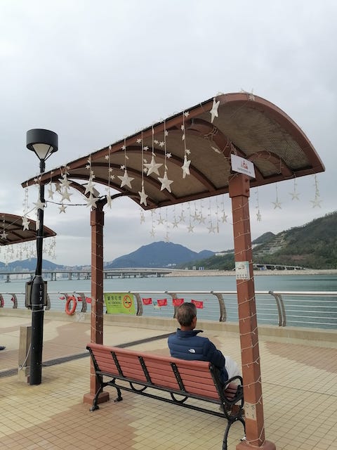海濱碼頭沒見人影,望山不見山,一列園景設置,頓然和暖這片寂寂靜靜! |