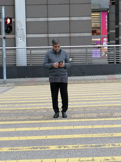 這位行人守法守規,綠燈未亮,先把手機來看……